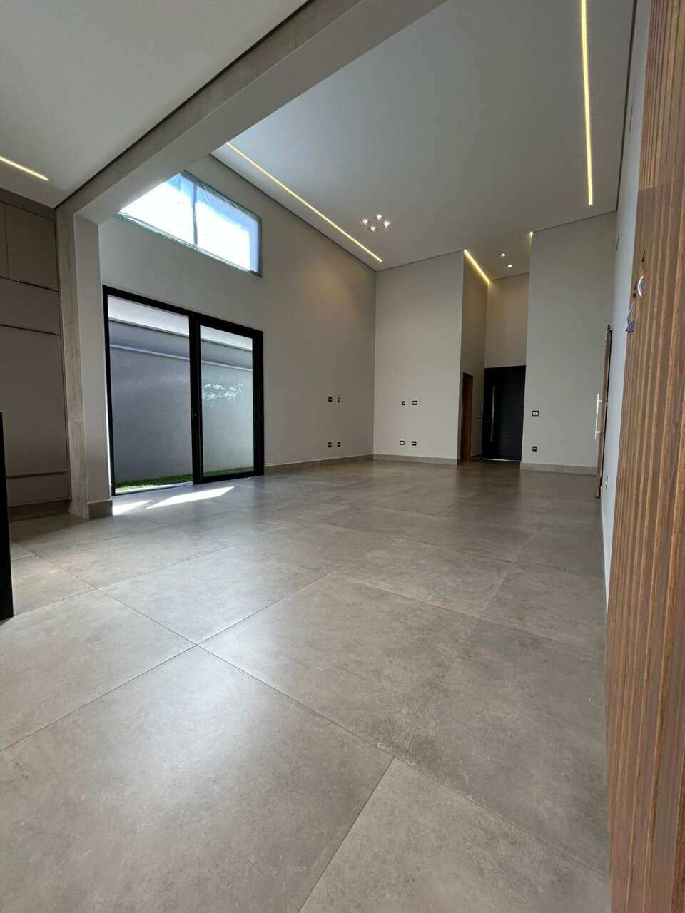 Sala de estar e jantar integradas, com pé direito imponente de 5 metros